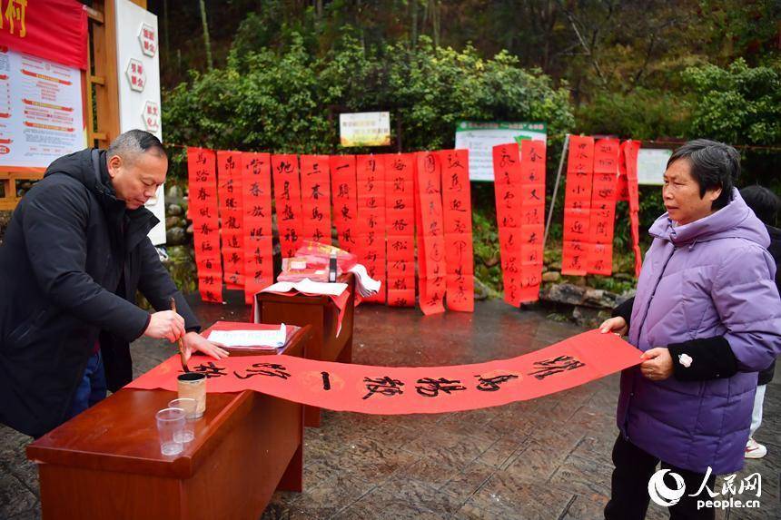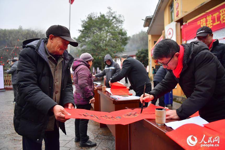 书法家泼墨挥毫写春联。人民网记者 时雨摄人民网井冈山2月2日电 (记者时雨)腊月井冈,年味正浓。2月1日,江西省和吉安市的书法家们走进井冈山茅坪镇神山村展纸挥毫,“福”字饱满,“春联”工稳,更为这座小山村添上鲜活的春意。