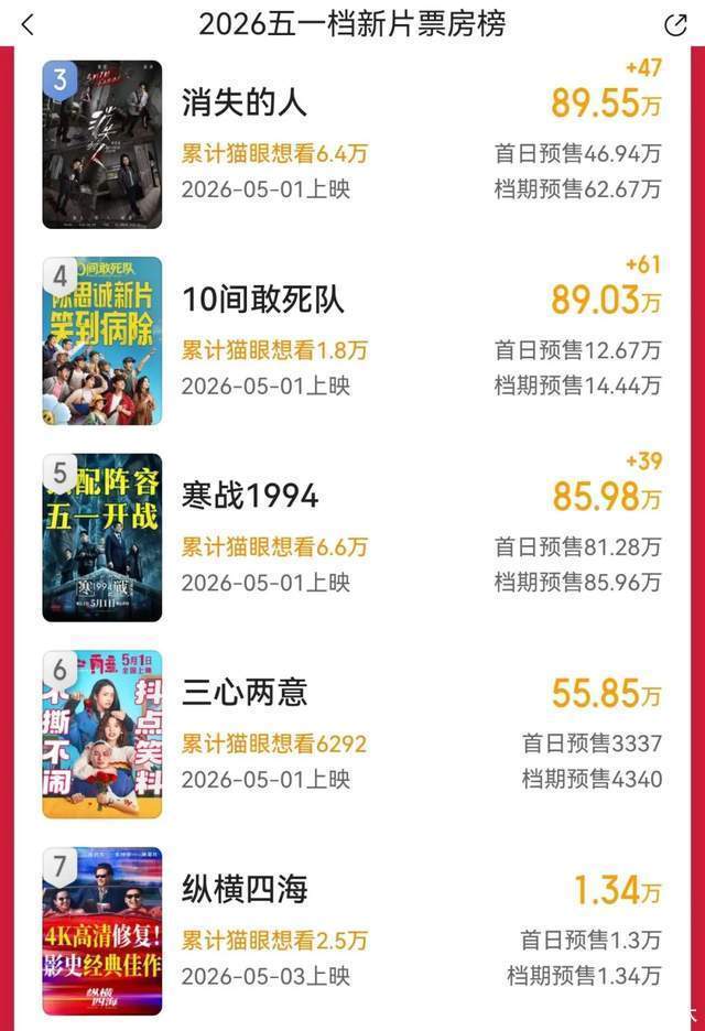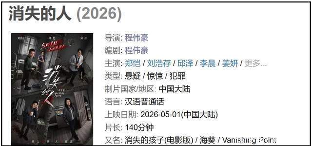 实际上,从预售排名第三的《消失的人》开始,才是2026年五一档电影真正的票房种子。