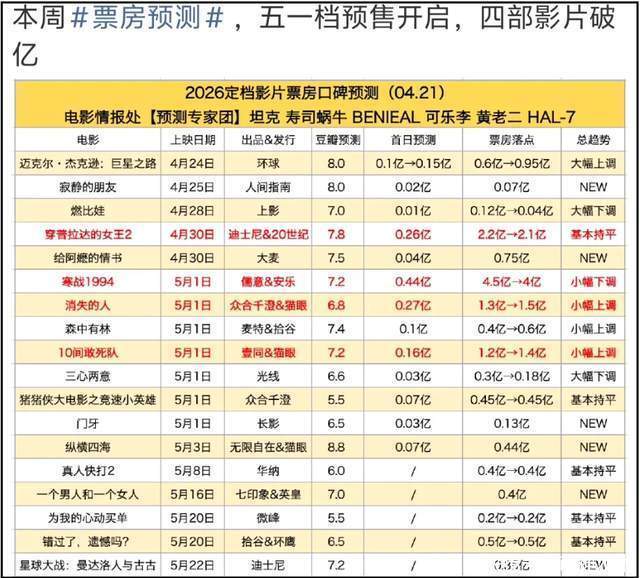 虽然上映之前被曝出歧视争议,但风波并未大规模出圈,经典前作打底,《穿普拉达的女王2》预测票房上调到了2.1亿,就看有没有国产片黑马能够拦一拦了。