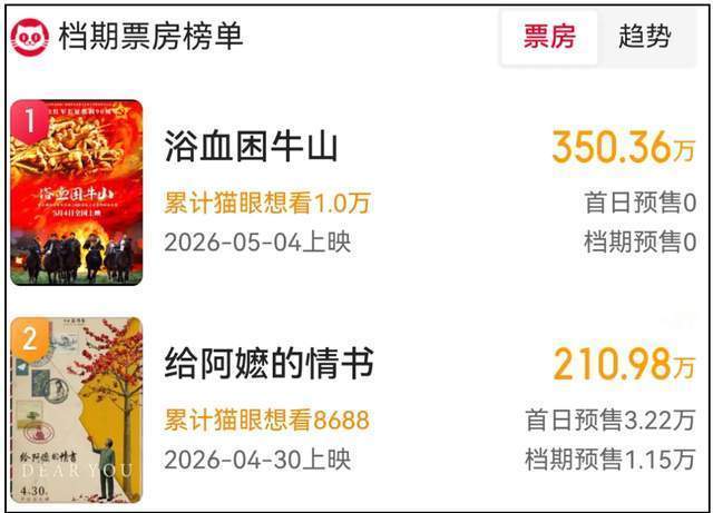 如今五一档电影开了预售,排在第一位的竟然是5月4日上映的《浴血困牛山》,预售票房仅有300多万。