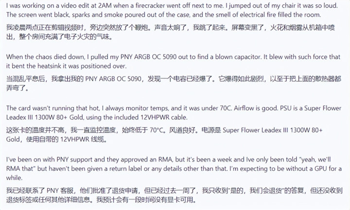 这位用户表示,当时显卡温度低于70摄氏度,系统运行稳定,但突然听到一声巨响,他描述道: