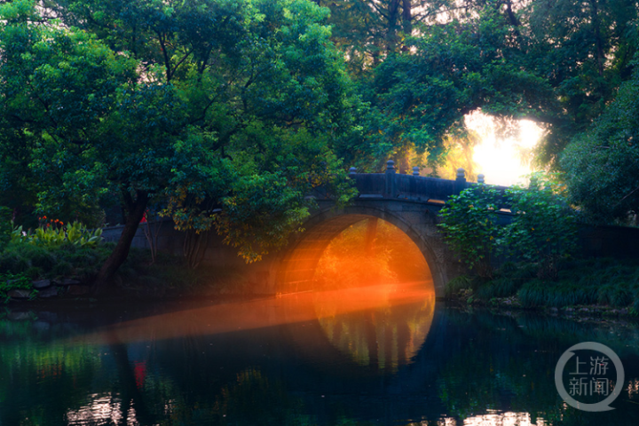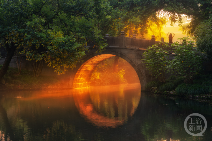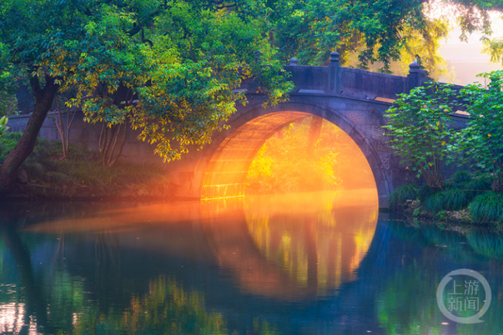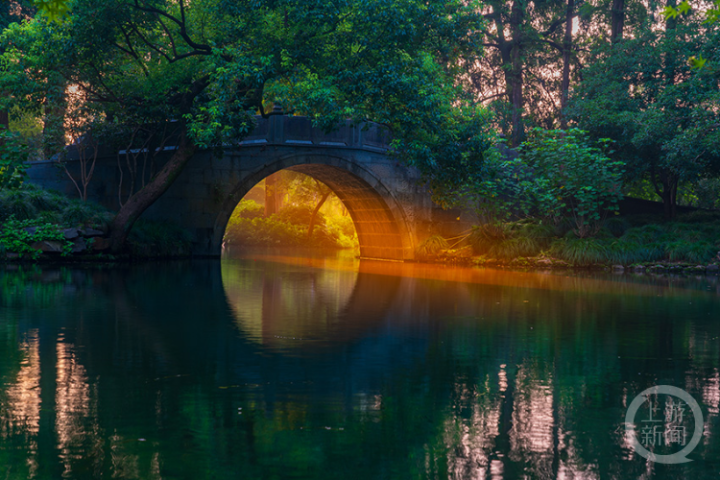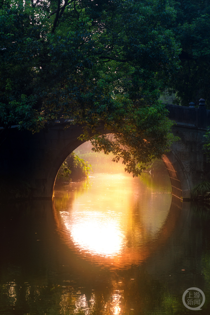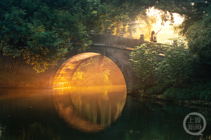 为了捕捉那一轮水中金月,上游新闻签约摄影师在凌晨三点半就起床,匆匆赶到杭州西湖。当第一缕阳光升起,金色的光芒穿过桥洞洒在湖面上,波光粼粼,仿佛古人所说的“浮光跃金”。