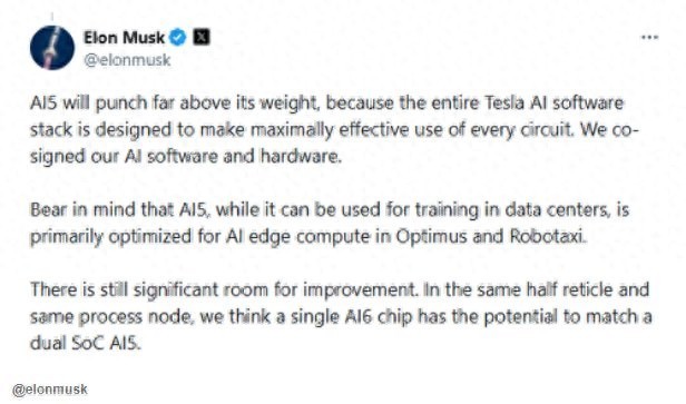马斯克在另一篇X平台的推文中说明,AI5芯片虽可用于数据中心的模型训练,但其主要优化方向是为Optimus人形机器人与Robotaxi自动驾驶出租车提供AI边缘计算支持。