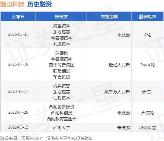 证券之星消息,根据天眼查APP于3月31日公布的信息整理,西湖烟山科技(杭州)有限公司A轮融资,融资额未披露,参与投资的机构包括海望资本,东方嘉富,常春藤资本,九派资本。
