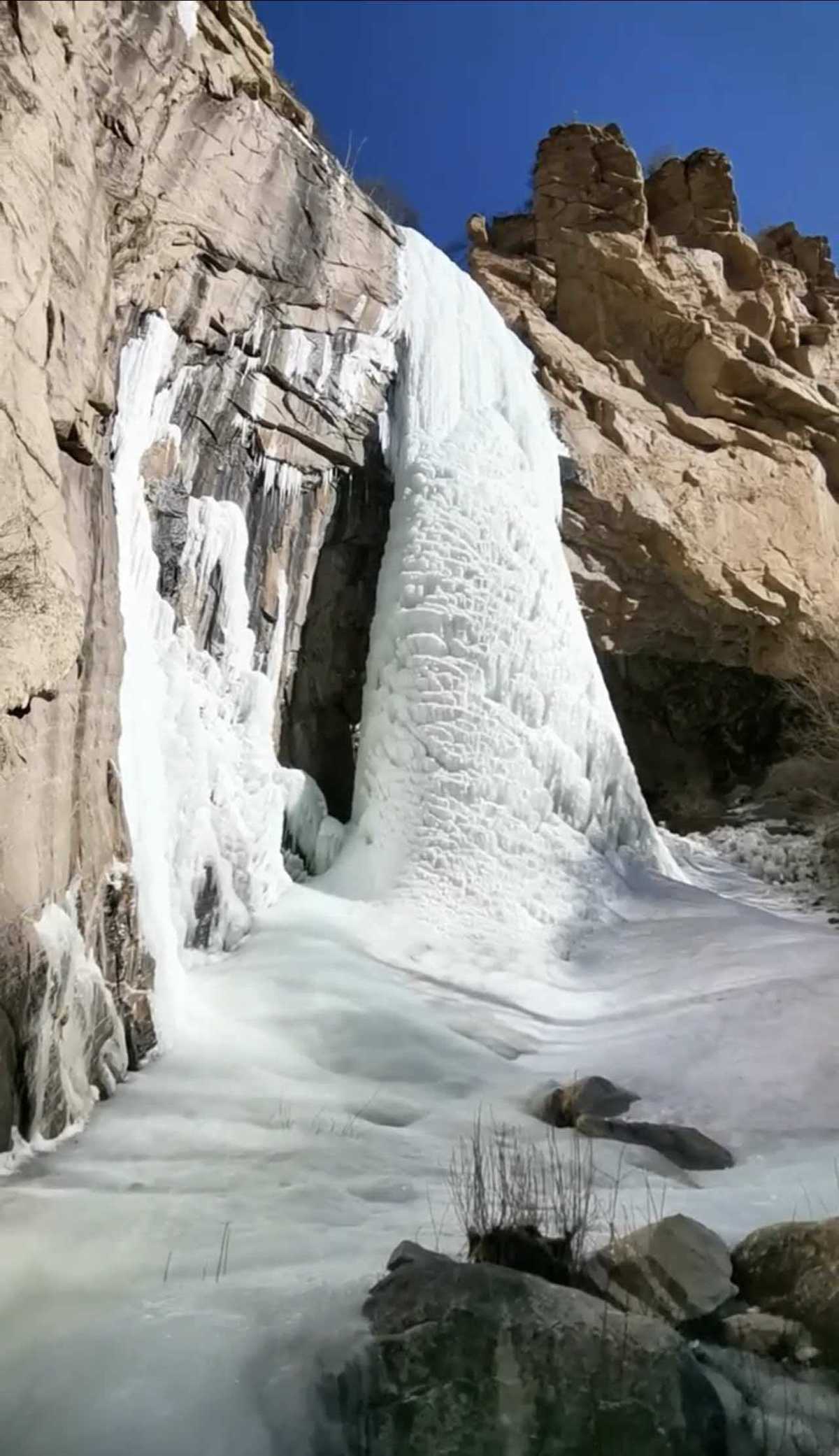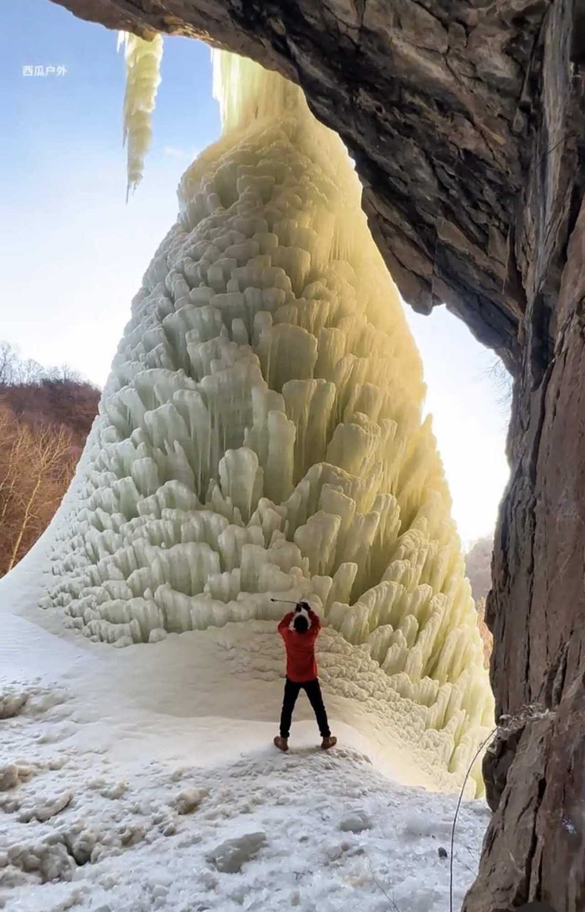 据上述网友发布的视频显示,一处冰瀑依附在黄色的崖壁上,从岩洞内侧向外仰拍十分壮观,巨大的冰柱表层呈蘑菇瓣状,在阳光的照射下熠熠生辉。