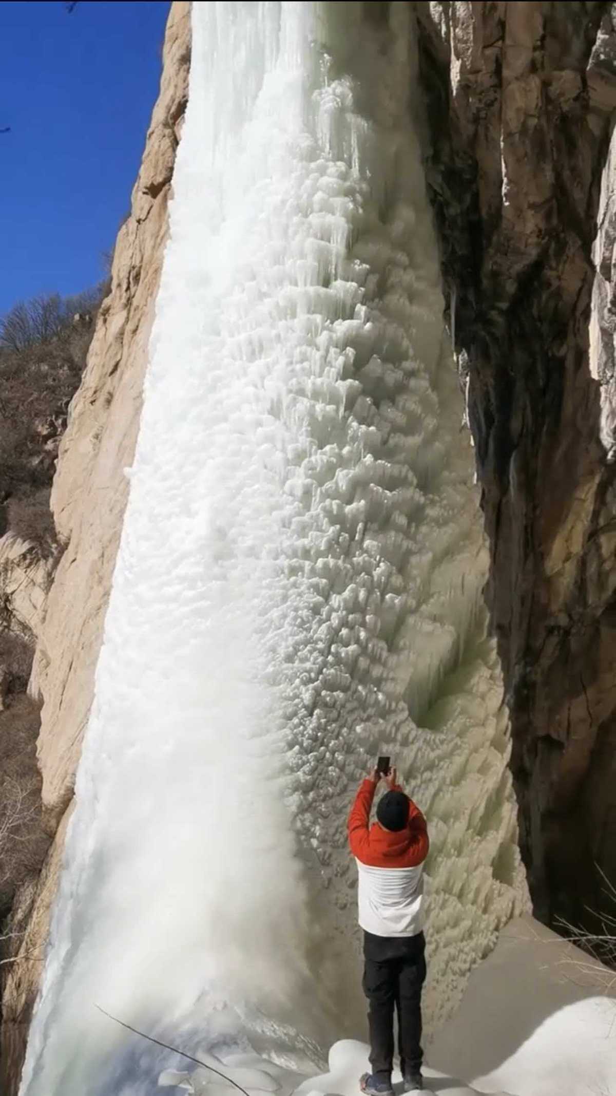 近日,有多名徒步爱好者发布了山西五台县石翁村滴水崖冰瀑布的壮观视频。2月5日,当地居民告诉极目新闻记者,这处瀑布落差有数十米,冰柱每年会持续好几个月。