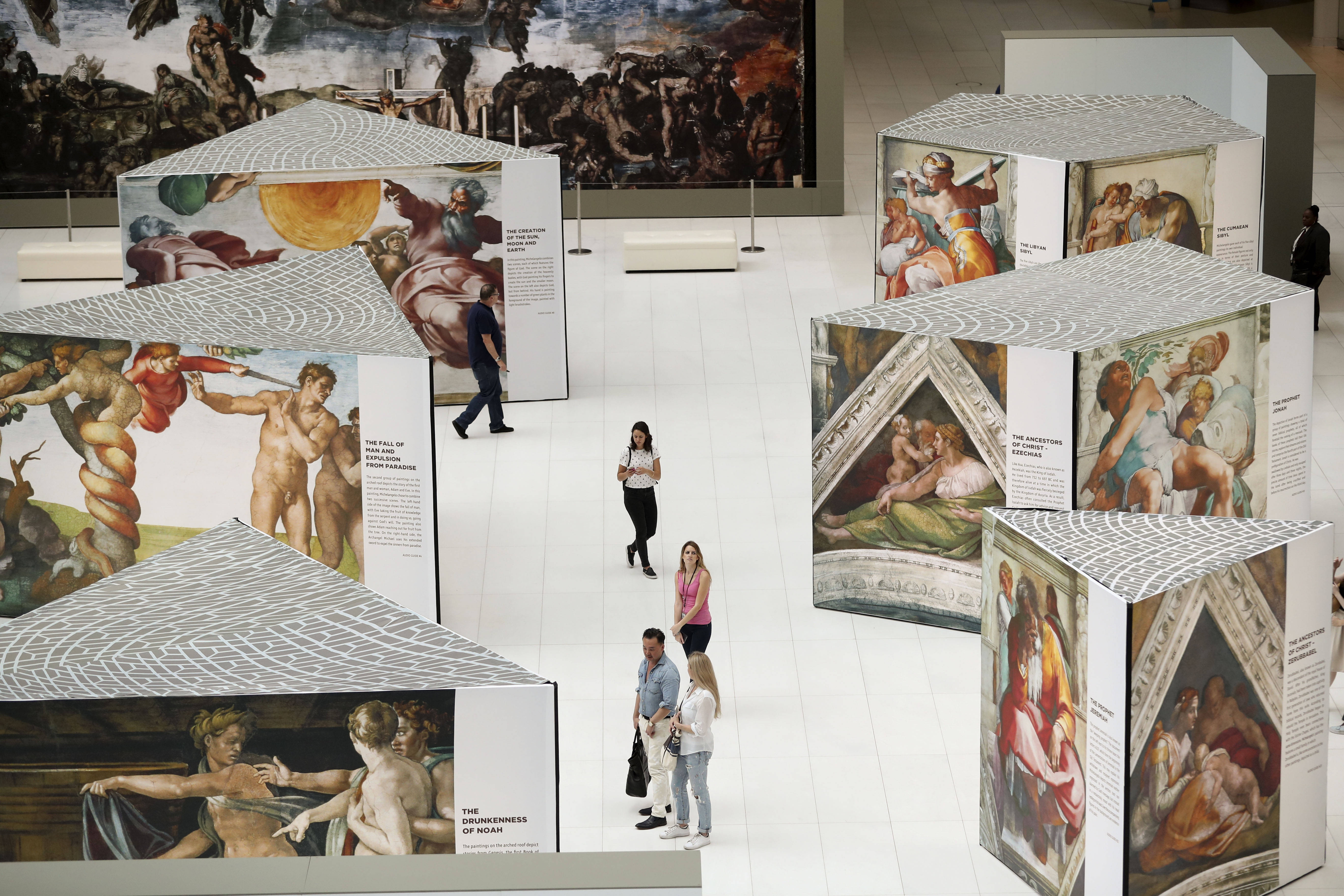 2017年6月23日,在美国纽约世贸中心车站,人们观看米开朗琪罗创作的西斯廷教堂壁画复制品。新华社记者王迎摄拍卖行网站介绍说,米开朗琪罗生前创作了大量素描,现存约600幅,目前已知其中仅约10幅由私人收藏,此次拍卖的便是其中之一。这同时也是迄今唯一现身拍卖场所的西斯廷教堂天顶画未公开草图。